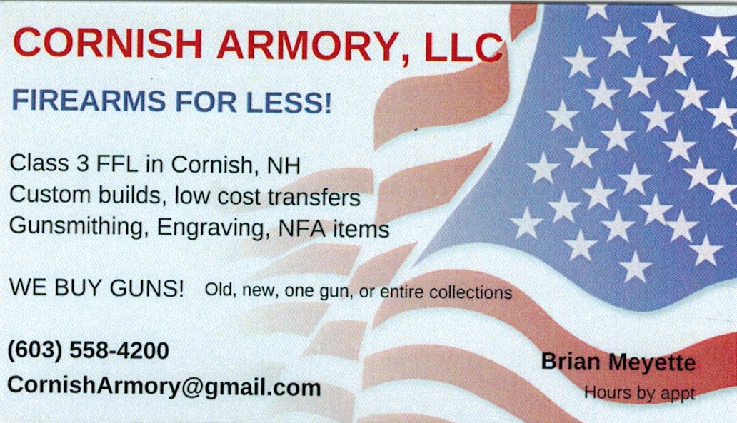 Cornish Armory is a veteran owned and operated family business located in Cornish, in rural western New Hampshire. The business was born of multiple generations shooting and collecting firearms of all types, by longtime life members of several state and national gun rights organizations. We are a FFL holder with Class III SOT for NFA sales. At Cornish Armory, the focus is on OUTSTANDING CUSTOMER SERVICE, as well as very low prices. When you deal with Cornish Armory, we guarantee that you will get personal attention to your order, and that every aspect of it will be handled promptly and correctly.